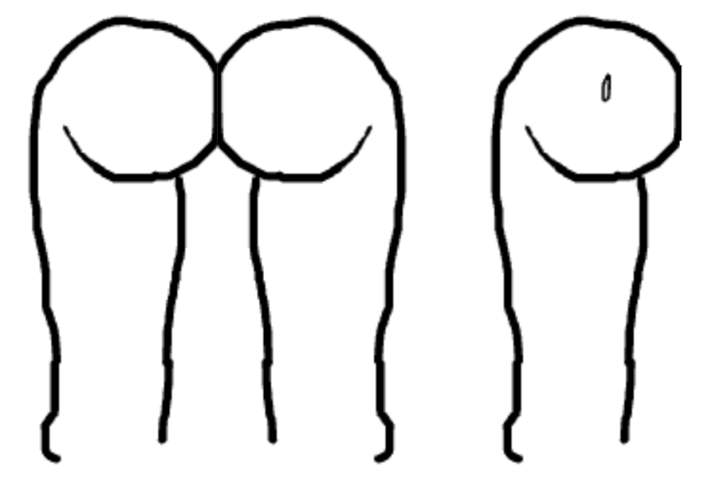 From the non-circular angle of the penis head as viewed from below, their is another heart-shaped fractal geometry that resembles the heart-shaped geometry of both breasts and necks, as well resembling the geometry of the gluteus maximus (buttocks), as illustrated in Images C (penis head), D (buttocks), and E above (breasts), respectively. Furthermore, as illustrated below, the Image in C, when doubled and arranged side by side, forms a fractal very similar to Image D.