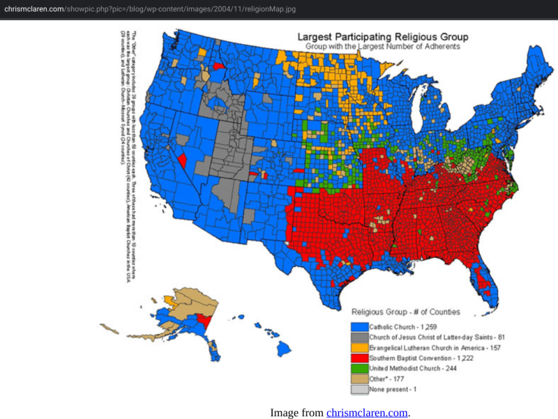 Looking for a political or religious pattern, we didn't find any. Because even though the states that protected minors the most in the Mid-West and Northeast were largely Democratic and Catholic states, so were those states failing to protect children the most, as illustrated by the 2020 elections map, and a map of Christian distribution across America, below.
