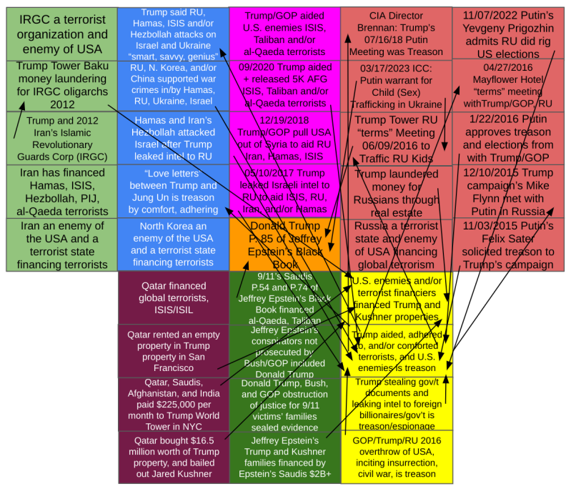 Consistent with our conclusions that Trump and the GOP are ineligible for public office based on their treason, one of our articles developed the following diagram based on Trump's and the GOP's adhering to, comforting, and/or aiding more than one enemy of the United States, but rather almost all of our top enemies, and where former CIA Directors Brennan and Hayden have come to and/or affirmed the same or similar conclusions for at least some of our treason conclusions, as has former federal prosecutor Glenn Kirschner, validating our conclusions.