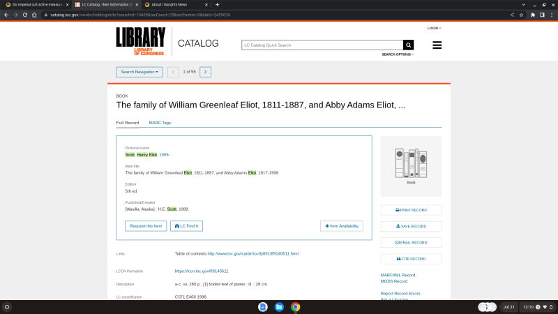 This pedigree was compiled by Harvard University's H.E. Scott circa 1988, and found decades later in his portfolio by his heirs, and compliments the genealogy he also published at the U.S. Library of Congress, in The family of William Greenleaf Eliot, 1811-1887, and Abby Adams Eliot, 1817-1908, CS71.E468 1988.
