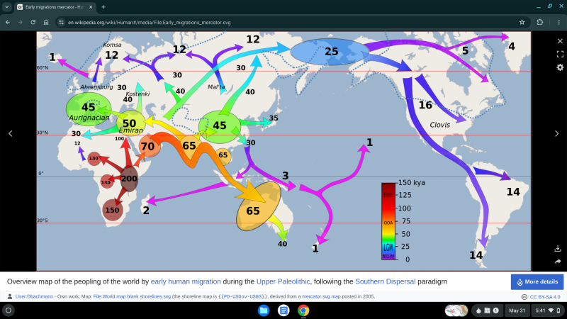 The following map of human migrations is also telling, because at the greatest human-neanderthal admixing location, the near epicenter of the Fertile Crescent above, corresponds to the two most Northeast routes of humans out of Africa between 50,000 years ago and 100,000 years ago below, almost perfectly overlapping with the Neandertal-human admixing dates of 47,000-65,000 years ago to more than 100,000 years ago, above. Note that the Fertile Crescent also then to a lesser extent flows into and across the Northern Mediterranean as does the admixing of humans and Neanderthals, as yet another spacial and temporal correlation. If this was the scene of a crime, and these early human discoveries were pinging cell towers, this might be enough evidence to convince a jury to convict.