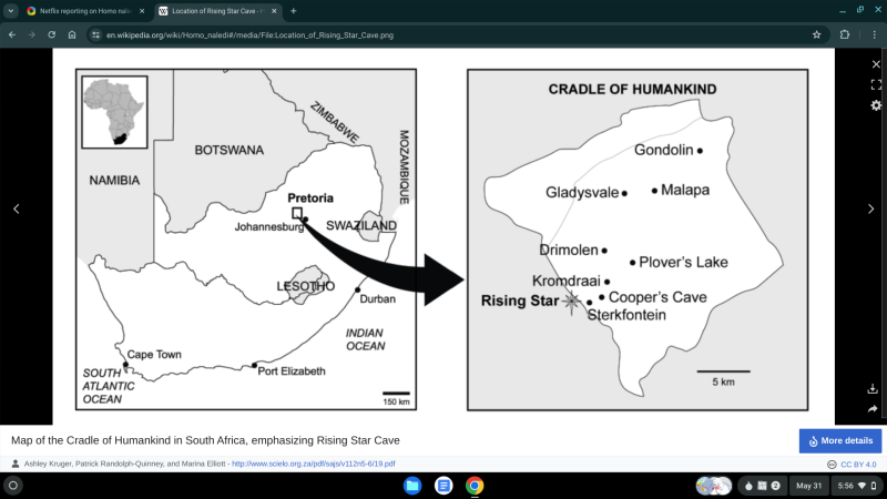 Homo naledi appears to have been found in the greatest numbers in Northeastern South Africa, and where modern humans are believed to have been derived from South Africa to East Africa, as illustrated in the human migrations map above.