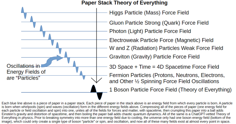 Continuing with our investigations -- experiences which impact the human experience and the nature and origins of the same -- we explored with our artificial intelligence researcher if a paper stack could be used as a theory of everything, if every particle was a disturbance on a different sheet of paper, each a field of energy the disturbance disturbs its own piece of paper, all compressed together into one piece of paper, then crumpled together to add Einstein's spacetime curve gravity, but pairing the same with quantum field theory by boiling the ball of paper.