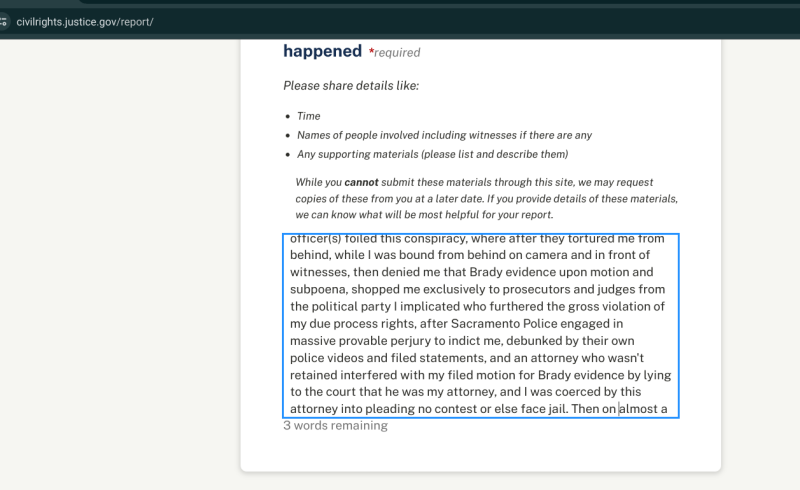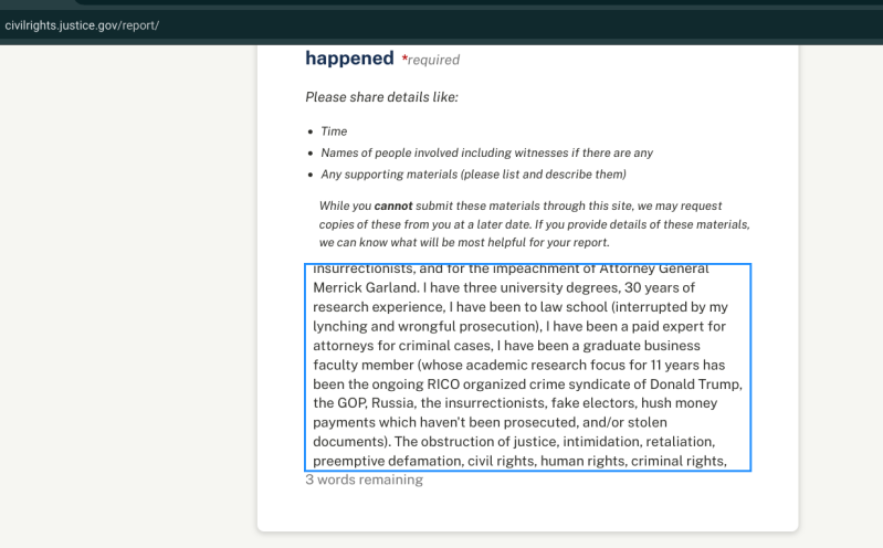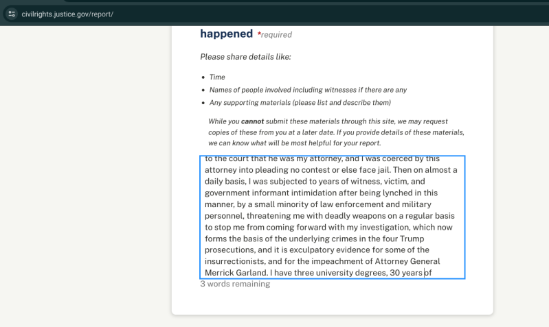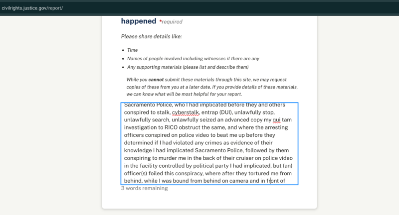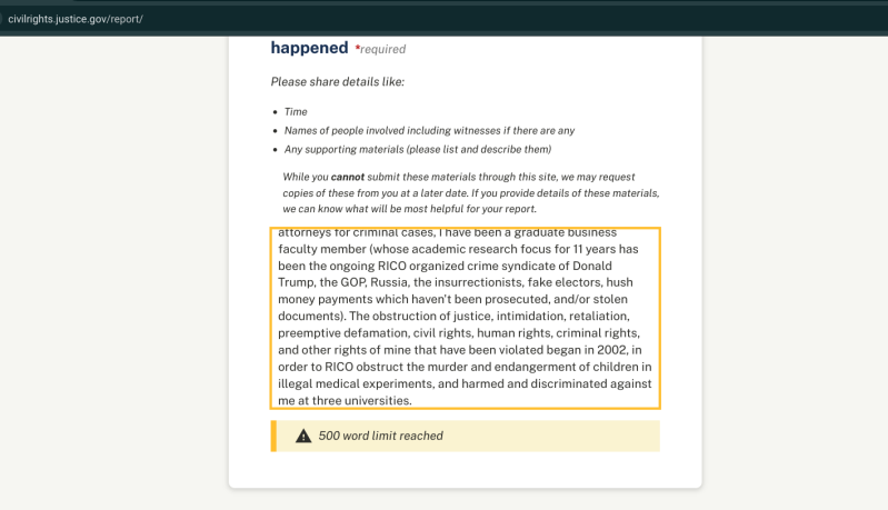 Important information to note on this first print screen is that it is not possible to provide the DOJ Civil Rights Division with evidence that supports that civil rights violation crimes have been committed against a victim, but instead the DOJ offers victims to let them know if they have evidence, and where our Editor did just that, letting the DOJ know that our Editor has evidence of major crimes against the United States, which prove civil rights violations against him. It is also important to note that it is a crime to falsely report crimes to the DOJ.