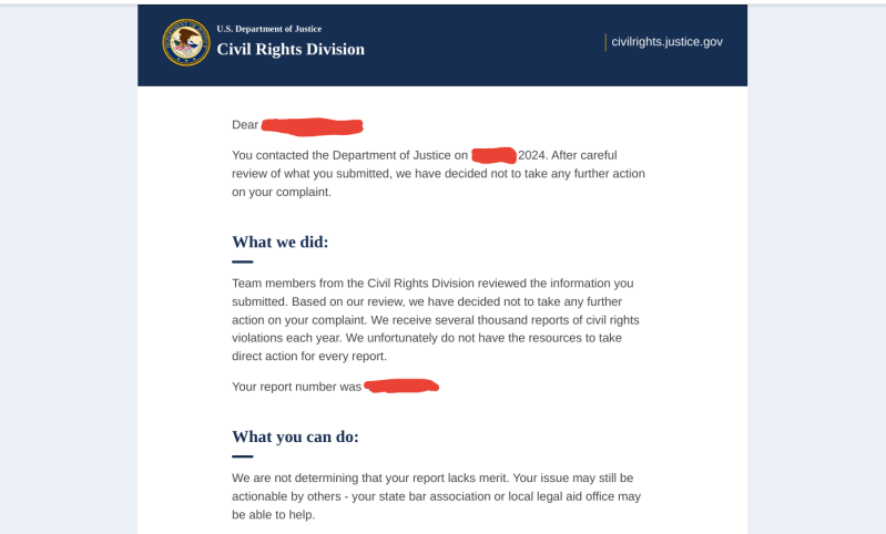 Here's how an "anonymous person" allegedly from the DOJ Civil Rights Division responded to a civil rights complaint supported by evidence that could prove major civil rights violations against the Editor of UpRights News, "we have decided not to take ANY further action on your complaint", and based on their "careful reading", and where they recommended contacting the State Bar Association (for an attorney) or a local legal aid organization, but where that recommendation per the previous "anonymous" email would only be issued if the DOJ didn't have the legal authority, when of course they did, and where they also specified they had the authority to have the civil rights complaint of the Editor of UpRights News "properly looked at" by other more appropriate agencies.