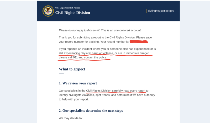 Any one of these claims, which can't falsely be made to the DOJ without being prosecuted, should have triggered a civil rights investigation and/or criminal referral, but instead, an "anonymous person", allegedly from the DOJ Civil Rights Division, specified by email that some other "anonymous person" would "carefully read every report to identify civil rights violations, spot trends, and determine if we have the authority to help with your report".