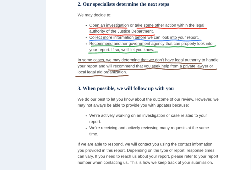 In some cases, per the print screen above, the Civil Rights Division of the DOJ may determine the following -- they "don't have the legal authority to handle the report", but as specified above, the DOJ Civil Rights Division did have the legal authority, because of the major violations of civil rights against our Editor, which he specified he had evidence to prove the same. However, as stated above, "if they don't have the legal authority to handle the report, then they would recommend seeking help from a lawyer or legal aid organization".