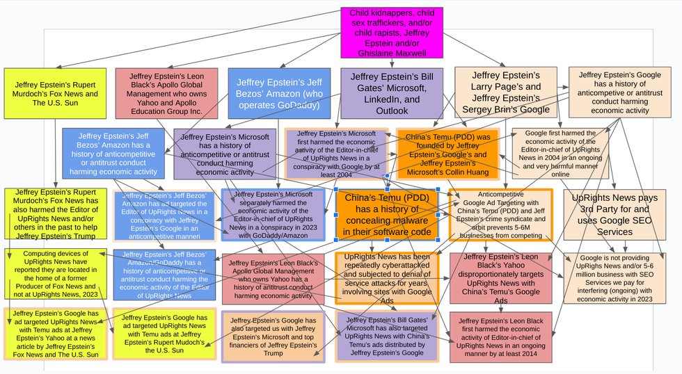 The next four diagrams explain their motive in helping enemies of the United States attack Israel, to create a distraction for the crimes of Trump, Russia, the GOP, Netanyahu, Jeffrey Epstein's crime syndicate, Cambridge Analytica, the Mercer family, the DeVos family, Alfa Bank, Rosneft, the fake electors, the insurrectionists, the hush money payments, the stolen and leaked top secret documents of the United States, and how all of this forms an enormous cabal of organized crime, terrorists, and financiers involving the same people and companies, over and over again.