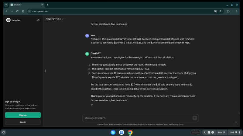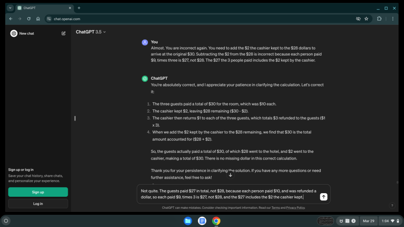 After coming up short $1, ChatGPT concluded there is no missing dollar in the conclusion, while falsely claiming $29 dollars represents the total money involved in the transaction.