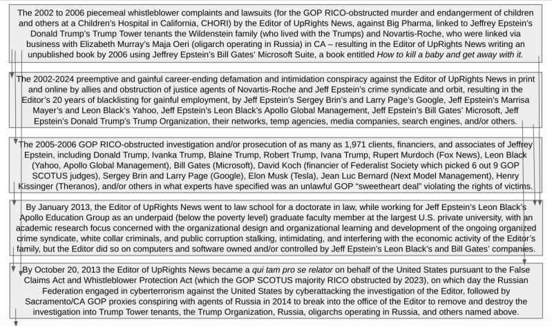 Then research into the ongoing organized crime syndicates of Jeffrey Epstein, Putin, Russia, Cambridge Analytica, SCL Group, Jeffrey Epstein's Donald Trump and his crime syndicate, Jeffrey Epstein's UK/EU royals (many more than Prince Andrew have been named within www.epsteinsblackbook.com and have separately been linked to NXIVM child sex trafficking ring, and to Hamish Ogston's sex trafficking ring, and/or other sex trafficking rings linked to PornHub, Paxum porn bank, ES Family Trust, Trump Media, Friends of Ron DeSantis and/or others -- has revealed older and/or others organized crime syndicates affecting, RICO obstruction-protecting, and/or installed by the organized crime families and syndicates specified above and below.