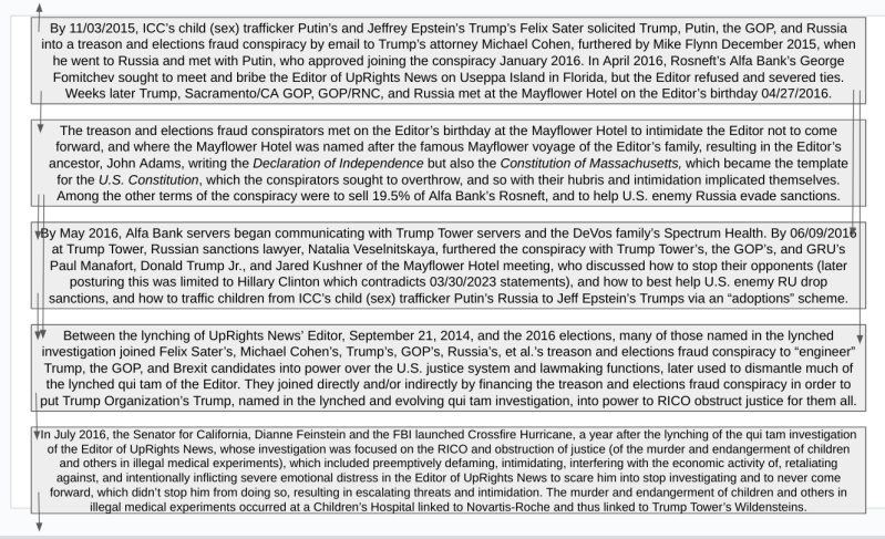 More simply, Trump, the GOP, Russia, those unlawfully usurping SCOTUS and other judicial offices, and the crime syndicate and orbit of Jeffrey Epstein, tried hard to bury the contents of the CA/Sacramento and Russian stalked and lynched pro se qui tam investigation of the Editor of UpRights News between 10/20/2013 and 09/21/2014, and thereafter, but now it is clear that what our Editor sought to reveal has at least in part been confirmed to the public by the conspirators themselves, leaving little to no doubt -- specifically, that Trump and the GOP are agents of U.S. enemy Russia, and were before the 2016 elections, disqualifying them from public office in an immediate manner then.