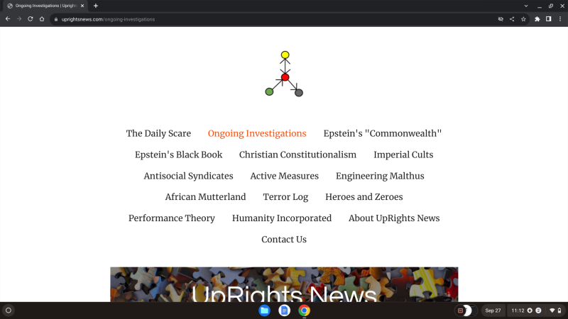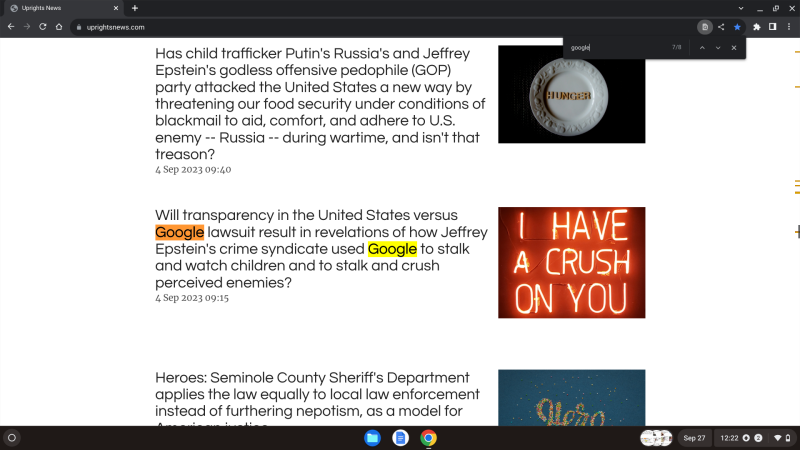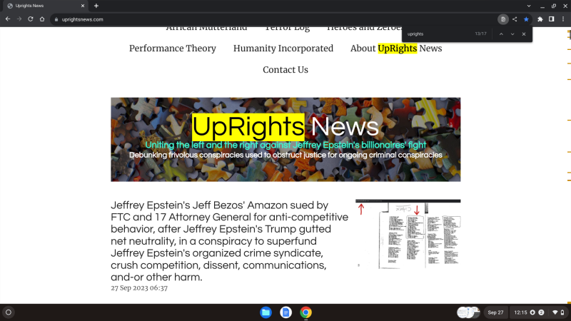 Suspecting ongoing fraud, we launched an investigation into Jeffrey Epstein's Google's antitrust conduct towards UpRights News, suspecting retaliation, witness intimidation, interference with economic activity, and and/or obstruction of justice on the part of Google, and suspecting they were doing the same because we had published many articles about Google and/or their founders as having been associated the operations of child kidnapper, child sex trafficker, and child rapist, Jeffrey Epstein, largely based on the investigation of the U.S. Virgin Islands' Attorney General and their attorneys at SDNY, whereafter we discovered that both we and others were not able to find UpRights News online using Google, despite us paying for Google SEO services.