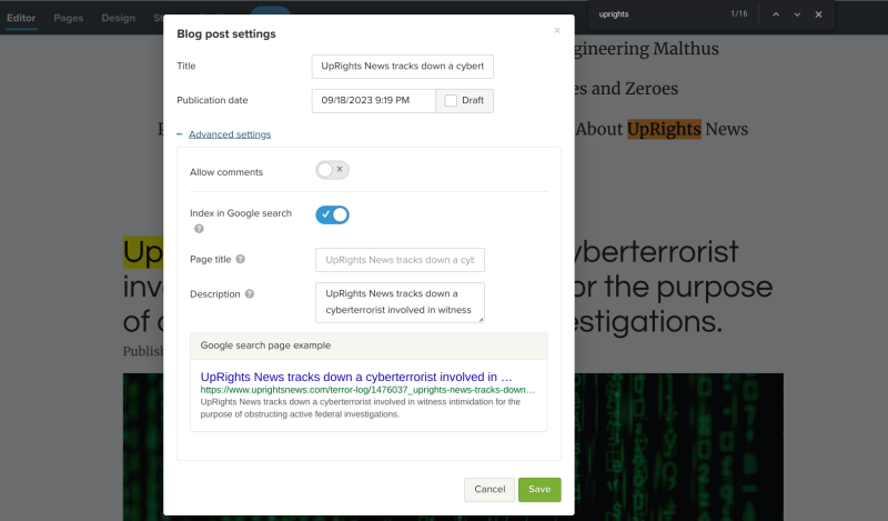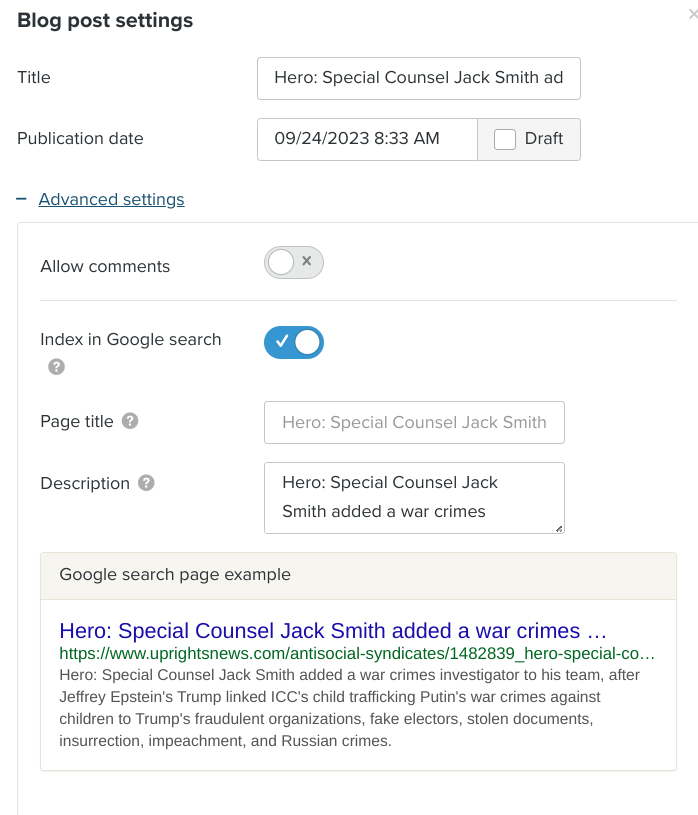 As specified in the very first print screen at the top, UpRights News was marketed that the website, if they purchased the subscription, would include a "complete" website in 10 minutes, optimized for Google. Part of this includes every page being developed have a Google search engine optimization (SEO) control page, as follows. The title and description fields allow for keywords to be placed, which Jeffrey Epstein's Google uses to optimize the search for that specific page. This way when Google's web crawler bots search the internet, those who pay for Google services marketed to them, have an advantage relative to those who don't pay for Google's marketed services, with respect to being found online.
