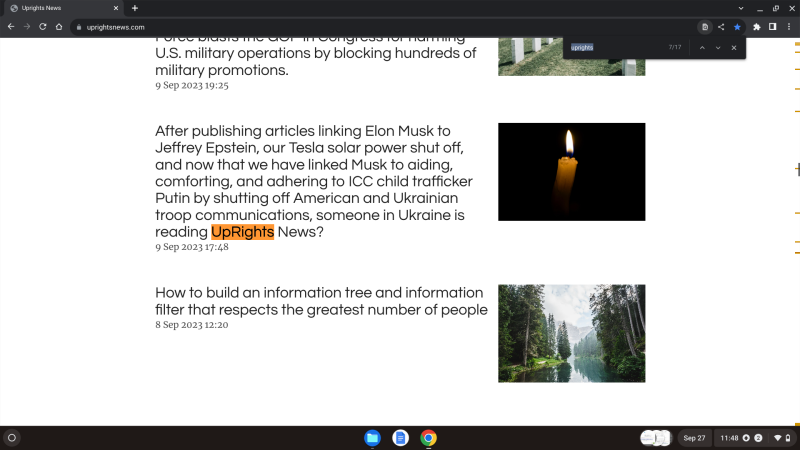 Outranking our exclusive use of "UpRights News" keywords in the scrolling document above, was "upright faces", "Upside" and "News", "Upright News" - but here it is important to differentiate - we uniquely spell the name of our news publication, "Uprights", plural, as in up your "rights", or united progressive (up) "rights", and so this very unique search term with the word "news" should have been found, because as promised, "a complete website", "optimized for Google" can be made in "10 minutes". And yet as specified above, we made this website in July 22, 2023, and this search was performed almost exactly two months later, on or after September 22, 2023.