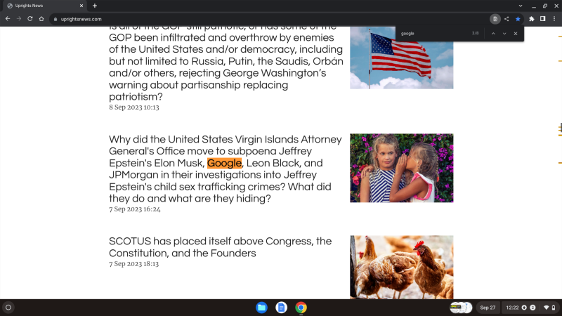 Here's another example from 09/28/2023, using our phone, of Google failing to propose our news publication, but proposing all sorts of other things instead, and yet the marketing claim was that in 10 minutes, we'd have a complete website that was Google optimized. It's been months Google, and "UpRights News" has been SEO optimized projecting no less than over 1000 searchable references to "UpRights News", including in Google specific SEO applications. Why can't you always find us Google? Why don't we always populate most of your first pages of results like we do in DuckDuckGo? Why aren't you recommending us Google? What happened to our business profile and $500 in Google ad credits you promised Google? You verified us, so where is our business listing Google? We think you should rename your company Zero.