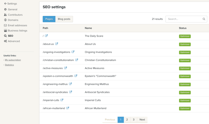 Then we search engine optimized every major section of our investigative news sections that we want to be public. The green box beside every section of our investigative news is specified as having been "optimized" for search engines, in particular Jeffrey Epstein's Google's search engine, supra. The blue box is for web sections we don't want optimized or which deactivated, having changed our strategy. Note that out of the 21 different sections, only 1 section was not optimized.