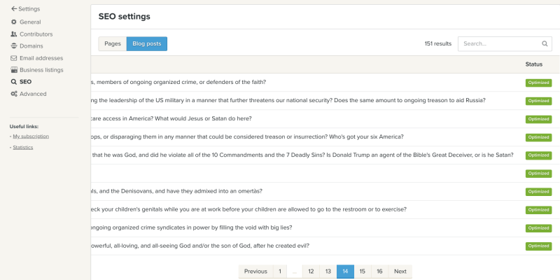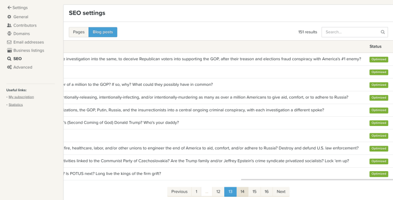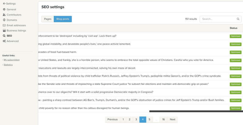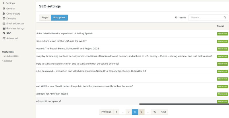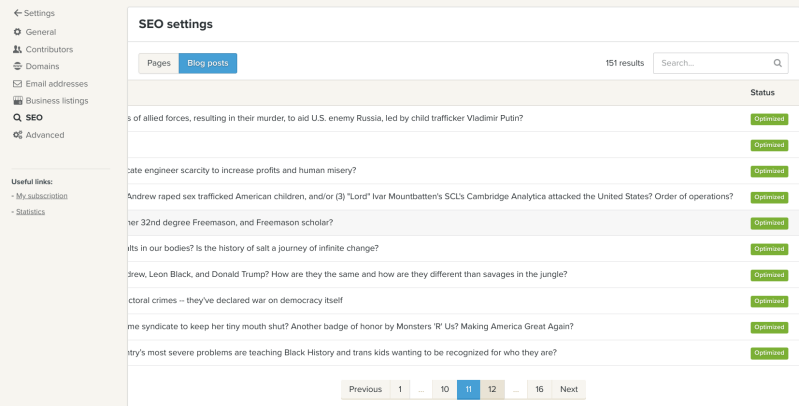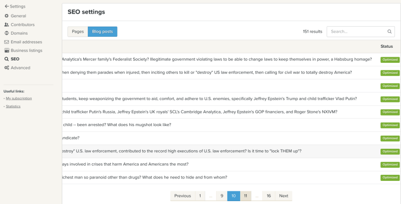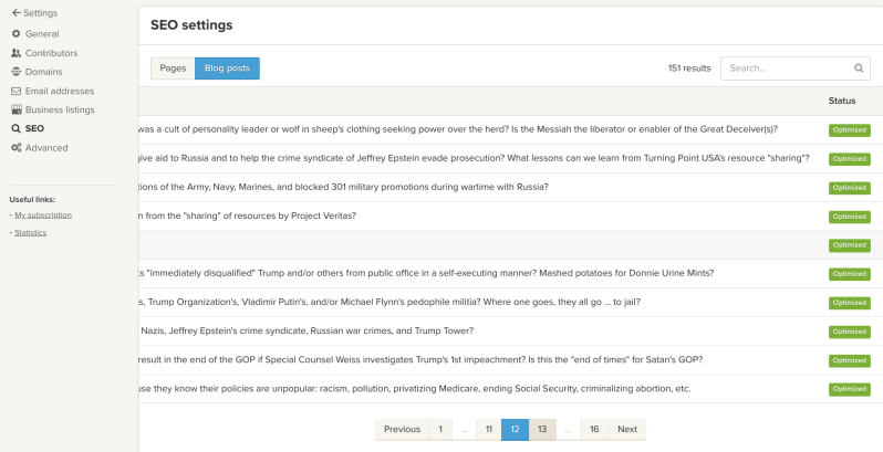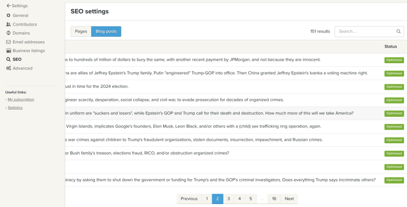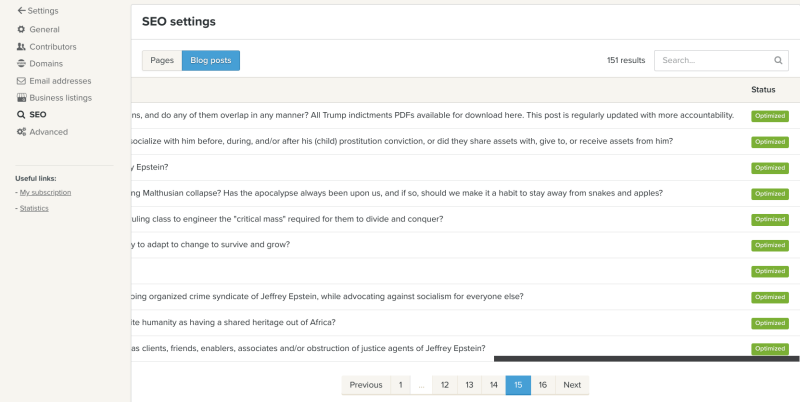 To help keep score here, we optimized every article we published at least three different ways in the blog settings, then we separately optimized every different section we wanted published. Then we also optimized every page or article we published beyond the blog settings, as follows. Note, out of the 151 articles we have published, 149 articles have been "optimized" for "increased visibility" on Jeffrey Epstein's Google, "faster indexing" on Jeffrey Epstein's Google, and that the two articles (blue boxes) that haven't been optimized are articles we are currently working on, and so they are "not visible to Google", as specified, which of course means that the 149 other articles that have been published, are visible to Google, as they should be, because that is the marketed service we are paying a premium for, and as a reminder, this section of our web hosting and web develop to "manage everything related to search engine optimization", which we prepaid in advance.