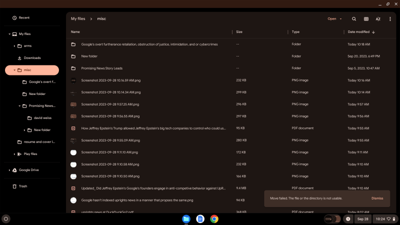 Here, Google Chrome's operating system has informed us that it has failed to transfer our files from one folder to another using Google Chrome operating system and Google accounts to connect to the same, as evidence of a denial of service cyberterrorism, cyberwarefare, cyberbullying, cyberstalking, cyberharassment, conversion of private property, retaliation against a protected whistleblower, intimidation of a victim, government informer, and witness for the purpose of obstructing justice, and/or other harm.