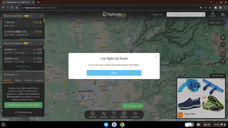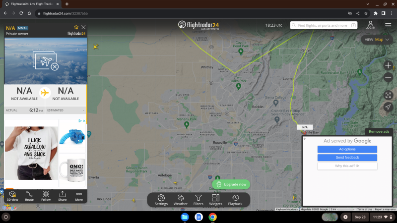 In other reporting, we have specified that we experience cyberattacks during assault and battery with deadly weapons incidents involving aircraft, for example as happened today. Note the add in the bottom right corner operating at the same time as the cyberattack (Google). Pretty strange for a "live flight" we were trying to identify after it dive-bombed our operations, not to be found on radar. It is hard if not impossible for most planes to just disappear from a radar, which ping a wave off the plane, which rebounds the wave back. But it is entirely possible for someone operating software (Google Ads) on the radar site to interfere with the same to obstruct justice for those involved in terrorism against UpRights News.