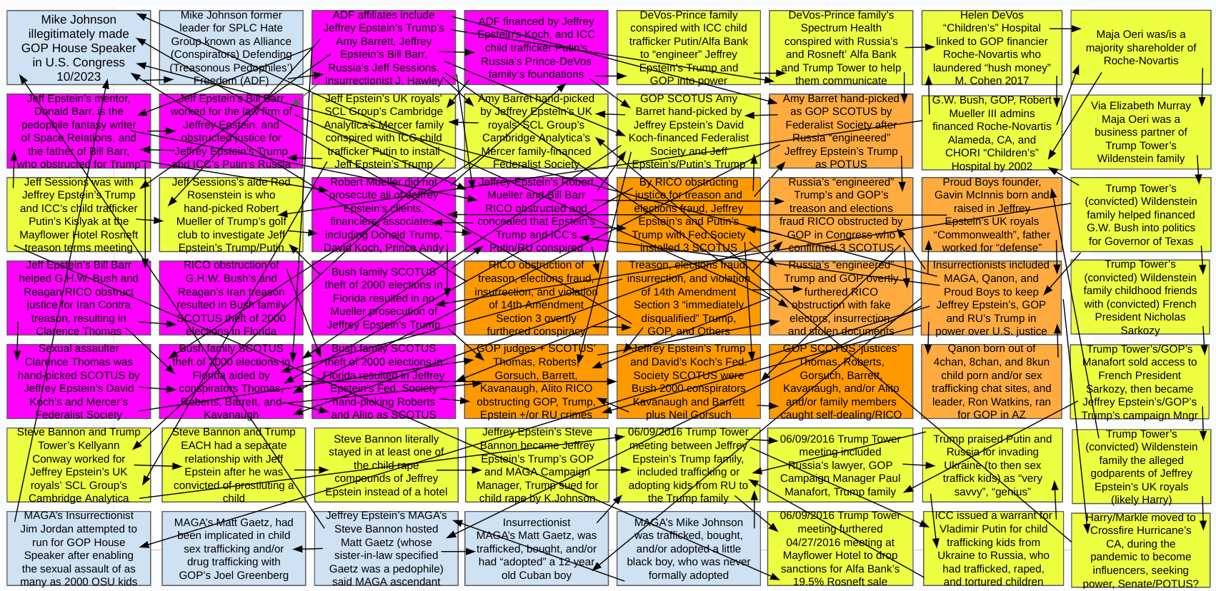 Accordingly, not only did Russia's and Jeffrey Epstein's overlapping orbits of the Mercer's, Breitbart News', Cambridge Analytica's, GOP's, Trump's, MAGA's, and/or the insurrectionists' Steve Bannon overtly further numerous plots to overthrow the United States, as did MAGA's Trump, MAGA's Matt Gaetz, as did MAGA's Mike Johnson, but all of them are directly and/or indirectly linked to notorious pedophiles (MAGA's Bannon both stayed with Jeffrey Epstein at at least one of his child raping and sex trafficking compounds, and was his apologist teaching him how to launder his conviction of prostituting a child) and/or are accused pedophile themselves (MAGA's Trump was sued for raping a child, specifically Katie Johnson in 2016, and he was separately named in Jeffrey Epstein's book of clients, financiers, and/or associates, per www.epsteinsblackbook.com), and MAGA's Matt Gaetz's sister-in-law specified he was a known pedophile, and MAGA's Matt Gaetz was separately accused of and/or implicated in child sex trafficking with GOP's Joel Greenberg, and MAGA's Matt Gaetz separately "adopted" a "little boy" from Cuba, though it is not clear that he actually formally adopted the child, and where MAGA's Mike Johnson also "adopted" a "little boy" of African descent, and yet it is not clear he formally adopted the little boy, who now as an adult seems to want little to nothing to do with MAGA's Mike Johnson, which a child sex trafficking victim also wouldn't want to spend time with their violator.[4][5]