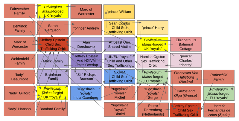 Among the claims made by the plaintiff, Combs engaged in homosexual and bisexual misconduct with Rodney Jones, who was sex trafficked to different countries, and who was coerced into sex with others, including with many different children, on the heels of 'prince' Andrew having been accused of raping sex trafficked children provided to him by child kidnapper, child sex trafficker, and child rapist Jeffrey Epstein, adding to the very long list of Privilegium Maius-forged and thus alleged 'royals' from the UK and EU, who have been named in the clients, financiers, and/or associates of Jeffrey Epstein, NXIVM, and/or Hamish Ogston, summarized in the network diagram above, which now included 'prince' Harry and 'prince' William.