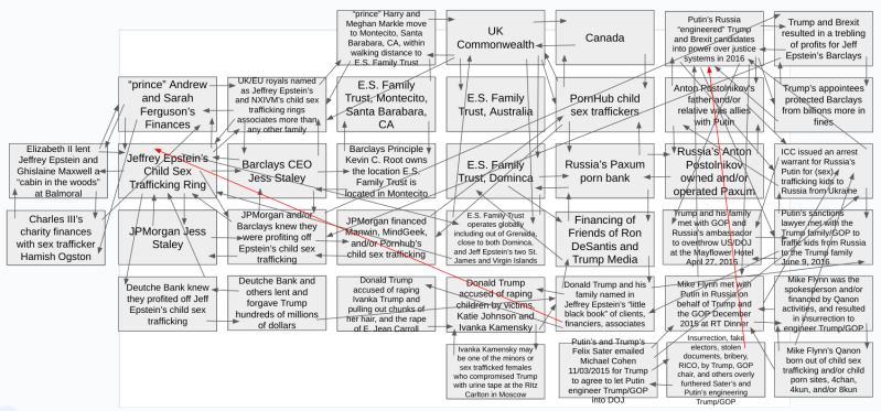 These next few diagrams illustrate how Jeffrey Epstein's child sex trafficking, NXIVM's child sex trafficking, Sean Combs' child sex trafficking, and/or Hamish Ogston's sex trafficking-linked UK and EU assumed "royals" -- who were the largest family found named across his child sex trafficking operations book of contacts, are heavily-linked to different child sex trafficking and predator conspiracies -- and in the context that UK royal Ivar Mountbatten is who directed SCL Group, which spun off Cambridge Analytica linked to the Mercers financing the Federalist Society's corrupted GOP SCOTUS judge picks, who conspired with Russia, the GOP, Trump, and others to overthrow the United States and the UK Commonwealth via Brexit and GOP candidate "elections engineering" in 2016, whereafter "prince" Michael of Kent sold access to the Kremlin.