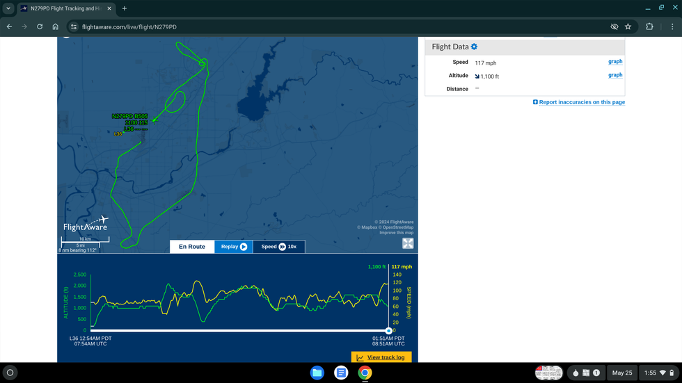 While working on the network diagram at the top of this article specifying the crimes of Sacramento Police, Sacramento Police flew out of the City of Sacramento, then out of the County of Sacramento, and beelined to UpRights News, then circled back over us, per the evidence below, blasting us at a very low 900 feet, which is so low that it shook our walls and windows. Note the time was 1:38 on May 25, 2024. Note also that per the green graph below, that after the pilot flew way off course and out of their jurisdictions, that the pilot nosedived towards our facility, and per the yellow graph below the pilot was accelerating towards our facility while nosediving the same, thereafter increased elevation and decreased acceleration, in precisely the same manner as a car doing that to a crowd would be committing a crime of threat with a deadly weapon (a vehicle).
