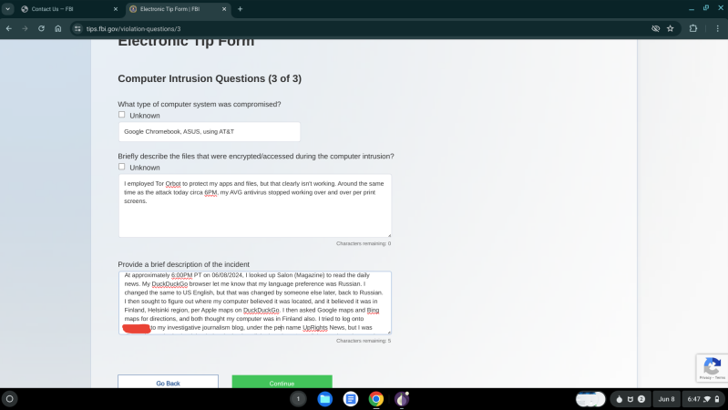 Accordingly, we attempted to update the FBI on this cyberterrorism directed towards us, but we were stopped from doing the same, due to an unknown error, interfering with FBI and our communications to obstruct justice for this ongoing organized crime.