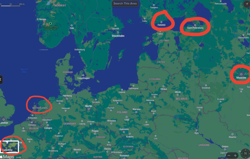 Accordingly, our computer believed it was located in Greater Helsinki Area bordering Russia, as did Apple, Google, and Bing maps, after we noticed our search engine had also recently been changed to Russia.